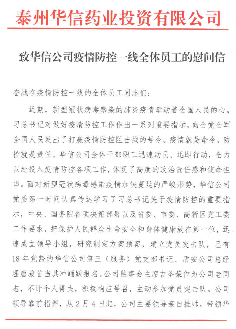 泰州華信藥業(yè)投資有限公司著力抓實“六個好”,努力做到防控機制到位、員工排查到位、設施物資到位、內部管理到位,多措并舉施策施力,全力打贏疫情防控和復工復產兩場硬仗。