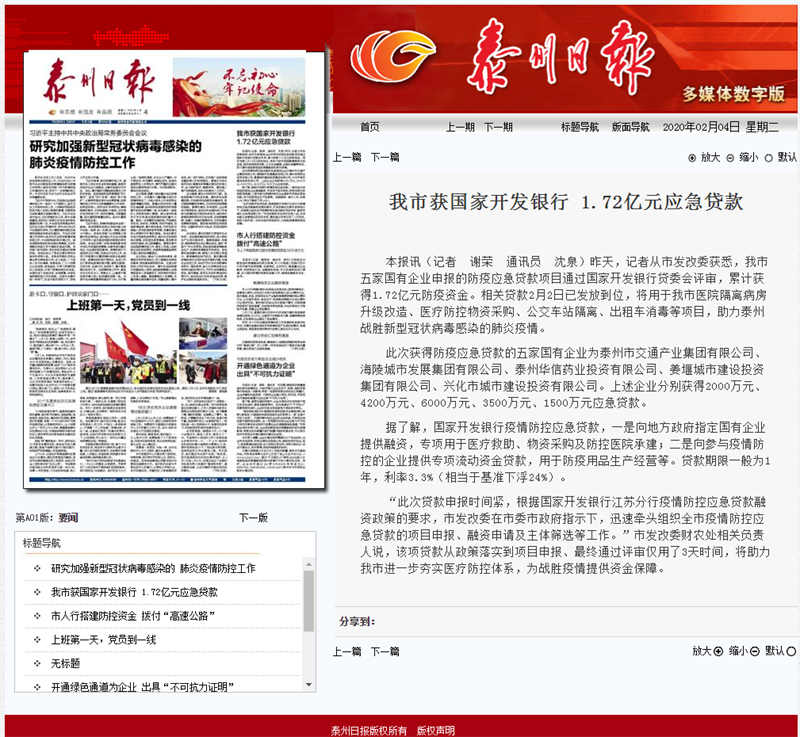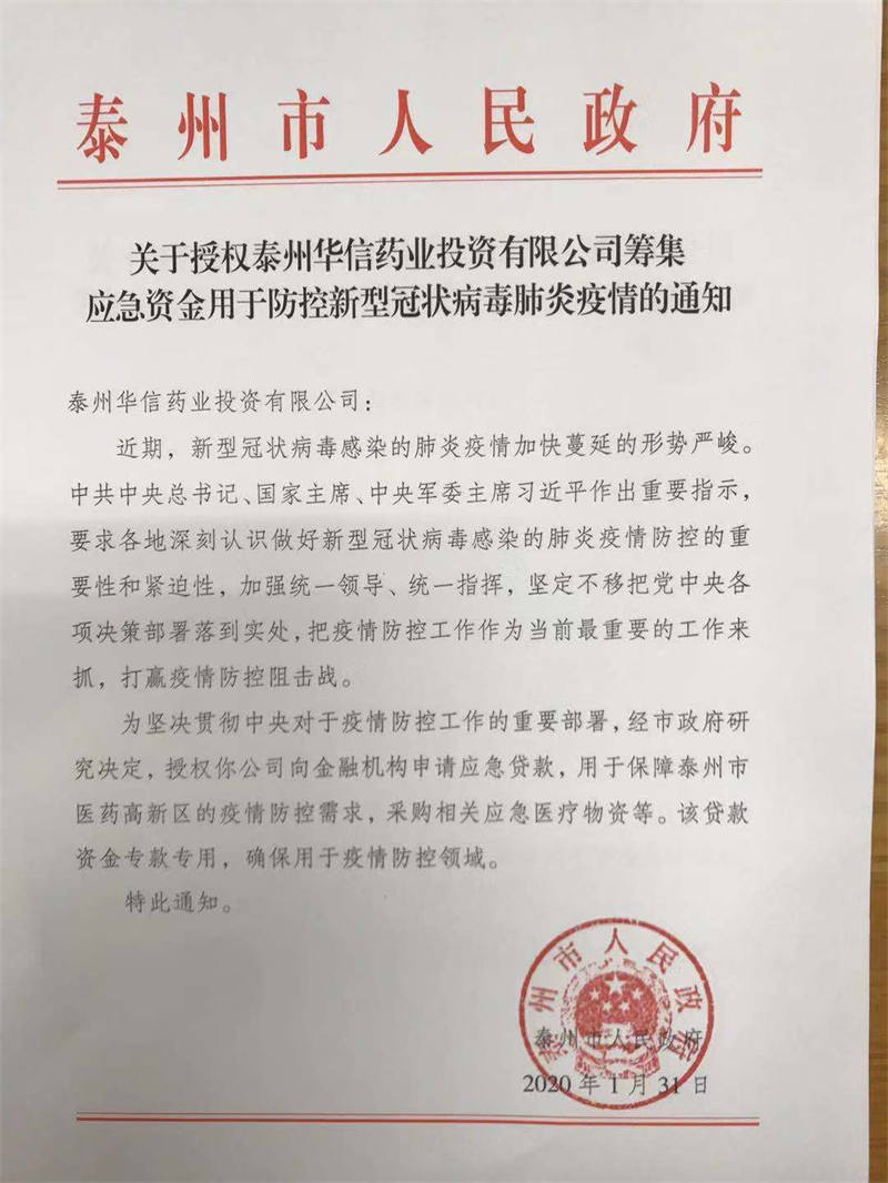 有些人說(shuō)“買(mǎi)一次口罩,消耗一只口罩”,但在自身物資緊缺的當(dāng)下,現(xiàn)場(chǎng)值勤的華信公司第三(服務(wù))黨支部已有18年黨齡的唐駿毅然拿出自備口罩,遞給了個(gè)別未戴口罩排隊(duì)的市民,這些舉動(dòng)自然沒(méi)有刻意,因?yàn)樗麄冎?,他們的職?zé)不僅要維持秩序,更要防止現(xiàn)場(chǎng)的交叉感染。 應(yīng)急資金不中斷,我們就是保障員 為堅(jiān)決貫徹中央對(duì)于疫情防控工作的重要部署,經(jīng)市政府研究決定,授權(quán)華信公司向金融機(jī)構(gòu)申請(qǐng)應(yīng)急貸款,用于保障泰州市醫(yī)藥高新區(qū)的疫情防控需求,采購(gòu)相關(guān)應(yīng)急醫(yī)療物資等。該貸款資金專(zhuān)款專(zhuān)用,確保用于疫情防控領(lǐng)域。