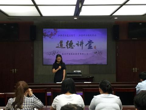 講堂活動(dòng)設(shè)作省身、唱歌曲、看短片、誦經(jīng)典、講故事、做點(diǎn)評(píng)和送吉祥七個(gè)環(huán)節(jié)。在誦經(jīng)典環(huán)節(jié)中,全體職工學(xué)習(xí)了老子《道德經(jīng)》第八章“上善若水”的內(nèi)容和釋義。